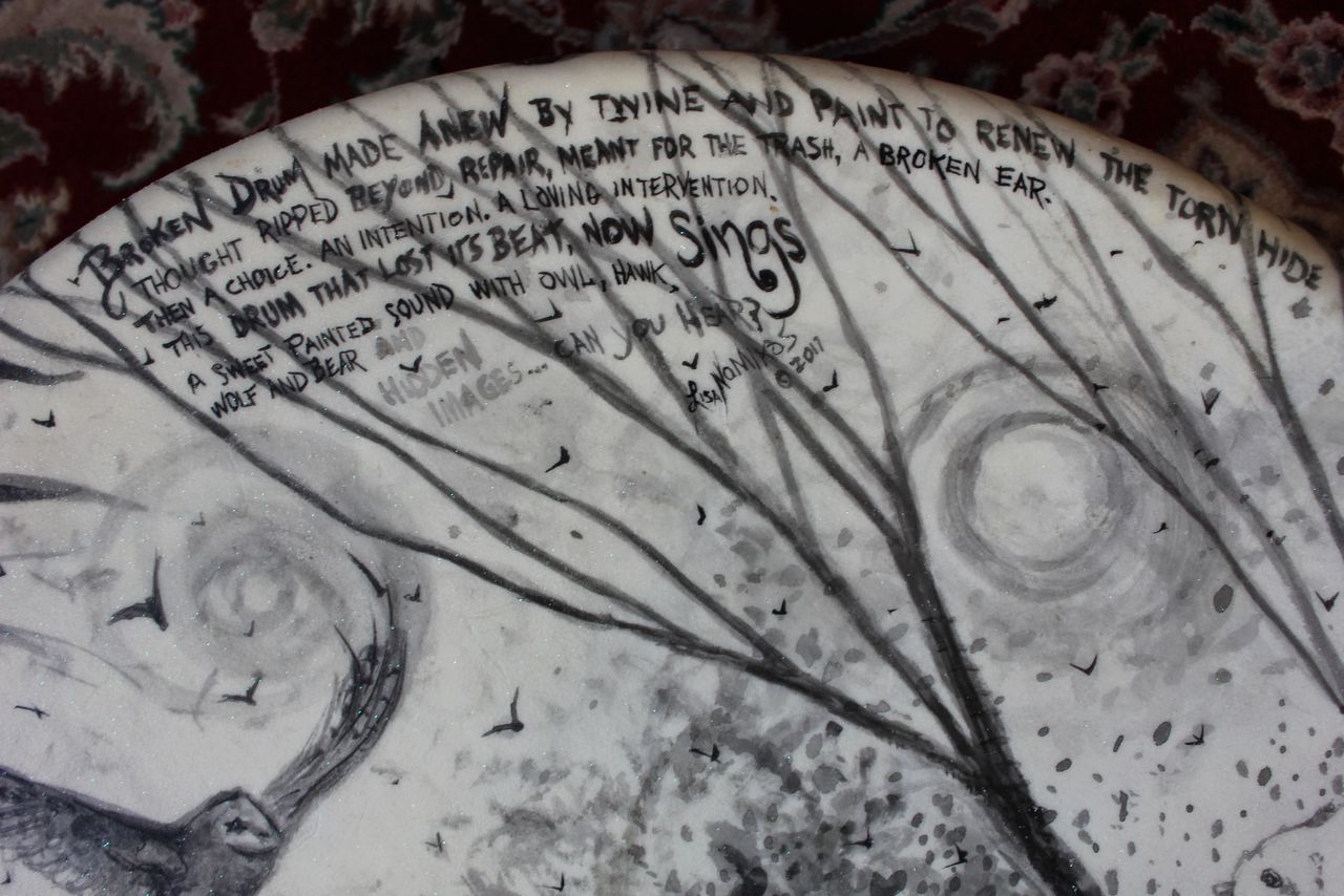 One day animals flowed from my brush onto its face as if to say, “we want to be seen”. Out they came, blue-eyed wolf that grew from the leaves of trees, and the hawk’s wing. Overhead did fly an owl and birds in the sky, and by wolf’s side, another owl stayed by, while white bear protected wolf’s hide. Above it all, in the branches of the trees, words of hope flowed forth from me…“Broken drum made anew by twine and paint to renew the torn hide thought ripped beyond repair, meant for the trash, a broken ear. This drum that lost its beat now sings a sweet painted sound with owl, hawk, wolf and bear, and hidden images…can you hear?”